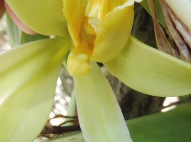 La flor es polinizada por un abejón; para obtener una mejor producción se debe polinizar la flor, liberando los estambres de una cubierta y luego frotándolos sobre el pistilo femenino. El fruto tiene la forma de un plátano pequeño.