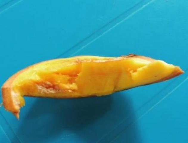 El fruto es grande, en promedio de 12 cm de ancho y posee 4 semillas grandes que ocupan casi todo el centro. La pulpa comestible que cubre la semilla, es delgada (3 a 4 mm). El aromo parece al mango, pero la textura es más firme.