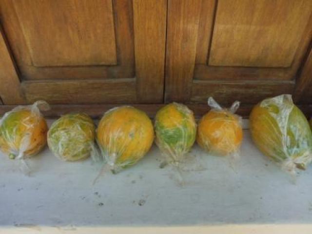 Los frutos son grandes, alargados y esféricos de color amarillo – anaranjado cuando maduran. Su consistencia es suave, contienen abundante pulpa dulce y muchas semillas. Las hojas son grandes y son más o menos segmentadas, según el tipo de variedad.