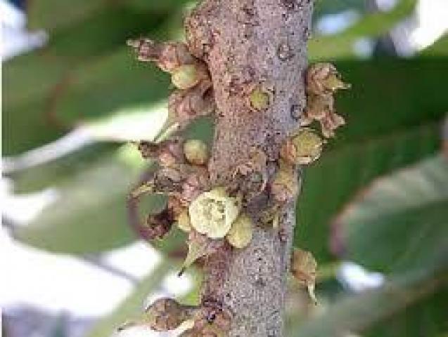 Las flores se desarrollan en grandes cantidades directamente sobre las ramas, son de color blanco crema.