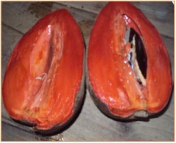 El fruto es ovalado de 10 a 25cm de largo, la cáscara de color café – rojizo, su consistencia parece papel lija. La pulpa es de color anaranjado o rojo, es muy suave y dulce, contiene uno o dos semillas alargadas y negras.