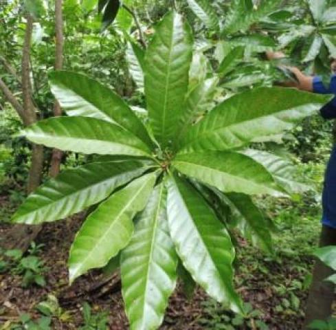 Las hojas se disponen en espiral, aglomeradas en las puntas de las ramas, son láminas simples dispuestas de forma alterna, de 6 a 25 cm de largo por 2.5 a 8 cm de ancho, con la punta aguda, el borde entero, de color verde claro y brillante en la cara al sol y verde amarillento en la contraria.