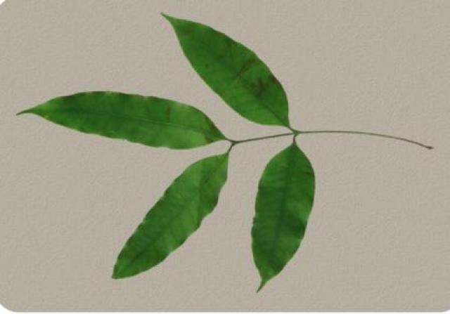 Las hojas son opuestas y oblongas de 2.5–12 cm de largo y 1–3.5 cm de ancho con ápice acuminado (terminando en punta aguda). Lámina foliar lisa.