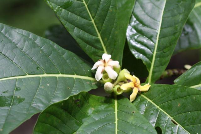 Flores hembras o machos (especie dioica como el Borojó). Llamativas como flores solitarias o hasta 10 en cimas hasta 10 cm de largo, parecidas al jasmin (misma familia).