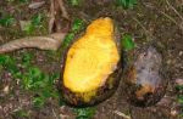 Frutos de hasta 15 cm, obovoides, el exterior parecido a un zapote. La cáscara es verrugoso, la pulpa es gruesa, fibrosa y suculento.