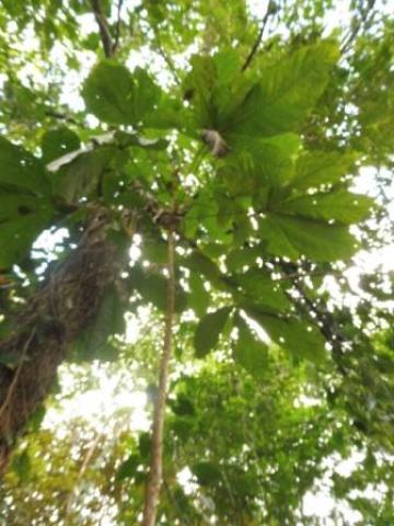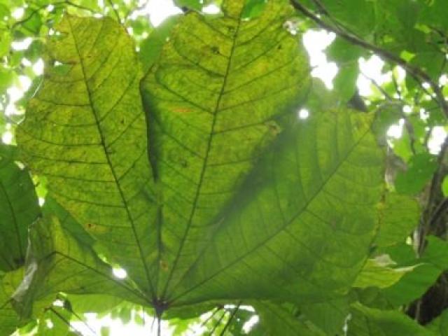 Hojas palmatisectas (divididos en forma de abanico), folíolos 5, obovados, hasta 46 cm de largo y 17 cm de ancho, acuminados, con tricomas estrellados dispersos en el envés; pecíolo hasta 48 cm de largo.