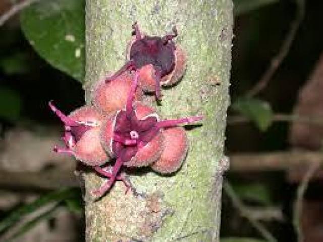 Inflorescencias sobre el tronco, flores bonitas asimétricas (actinomorfas), purpúreas; sépalos 3; pétalos 5.