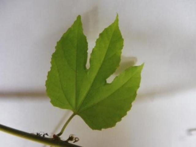 Hojas profundamente 3-lobadas, 7–15 cm de largo y 8–18 cm de ancho, lobos agudos a acuminados, base truncada a subcordada, márgenes irregularmente serrados, densamente puberulentas en el envés; pecíolos 2–5 cm de largo, con un par de glándulas grandes en la base.