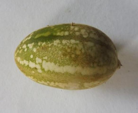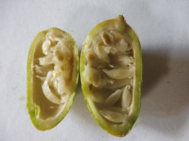 Frutos elipsoides, 5–6 cm de largo y ca 3 cm de ancho, verde-cafés con manchas blancas, puberulentos; semillas reticuladas.