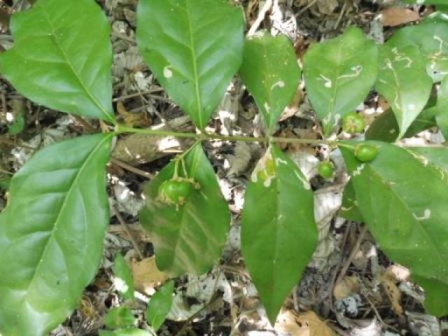 Arbusto o árbol pequeño, 1 a 6m de alto. Hojas opuestas, regularmente espaciadas en pares sucesivos y separadas por entrenudos. Tamaño hojas: 3–10 cm de largo y 1.5–5 cm de ancho.