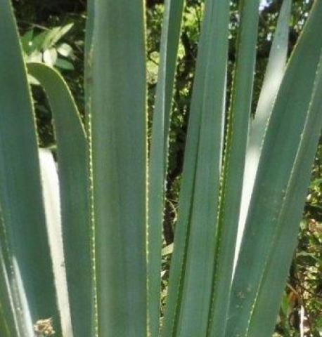 El color de las hojas es verde profundo a verde claro. En los margenes se encuentran las espinas en forma de dientes curvos de 2 a 5mm de largo. En la punta de cada hoja, hay una espina apical 1.5–3.5 cm de largo, café obscura.
