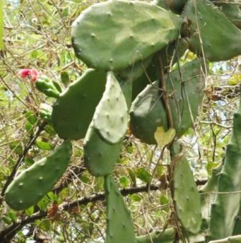 Especie común en las fincas de la zona seca, pero también presente en Laguna de Perlas. Importante como planta de reserva alimenticia adaptada al cambio climático que resiste a las sequías. Existen cinco especies en Nicaragua, de las cuales hemos inventariado dos: O. ficus indica, planta grande con flor roja (ver foto principal y foto 1 y 3) y O. guatemalensis, planta más pequeña, creciendo en colonias en las partes muy secas, p.ej. Isla Zapatera. Su flor es amarilla (ver foto 4).