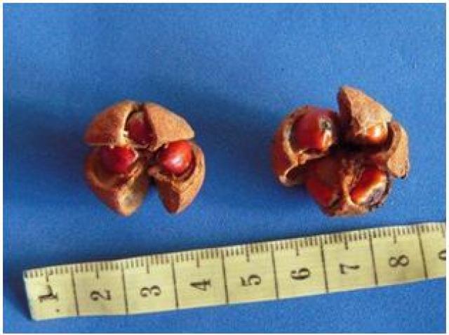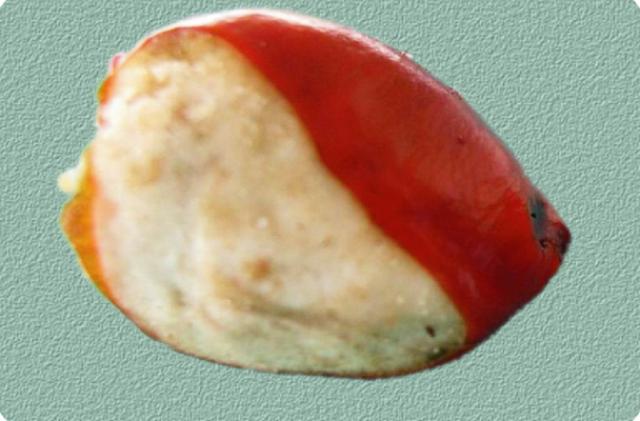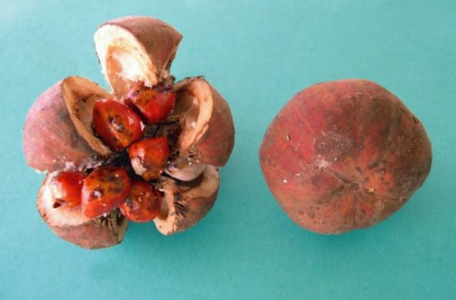 Los frutos con forma de pera, carnosos, azucarados y de color rojizo al madurar. Se abren en 4-8 valvas, contienen una o dos semillas por lóculo con cubierta anaranjado a rojo brillante.