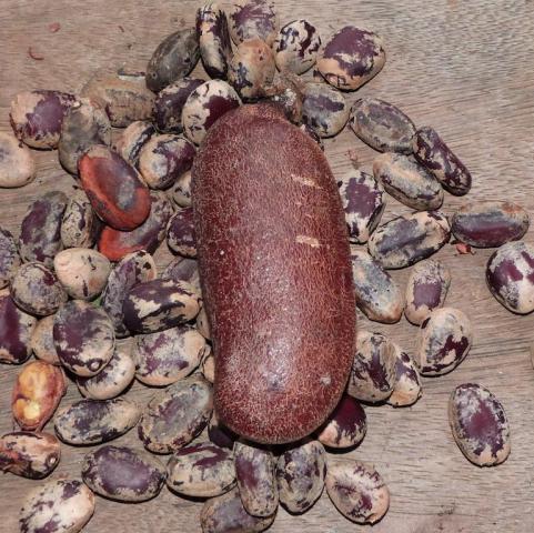 Las frutas son unas vainas gruesas de aprox. 13 cm de largo de cáscara muy dura de color café oscuro. Las semillas son oblongas y achatadas cubiertas por un polvo blanco.