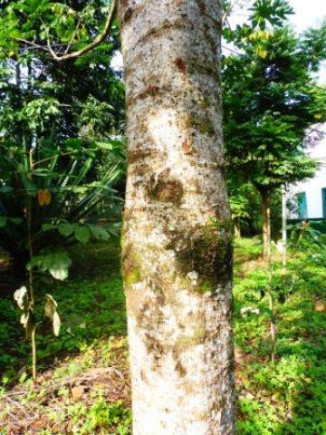 Fructifica en racimos de 12 o más frutos de forma cilíndrica, cada uno de 5 a 9 cm de diámetro por 6 a 10 cm de longitud y peso de hasta 380 g; presenta cáscara lisa y fina, de color verde que se torna amarillo brillante después de caer del árbol.